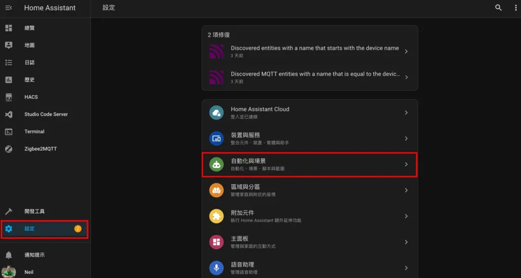Step 1-1. Home Assistant ➜ 左側「設定」➜「自動化與場景」