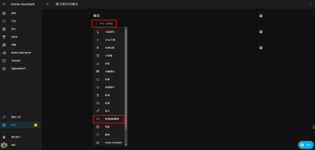 選擇「新增一個觸發」➜「數值變動觸發」,因為在這個自動化設定裡,我們要使用在家人數的改變來觸發自動化。
