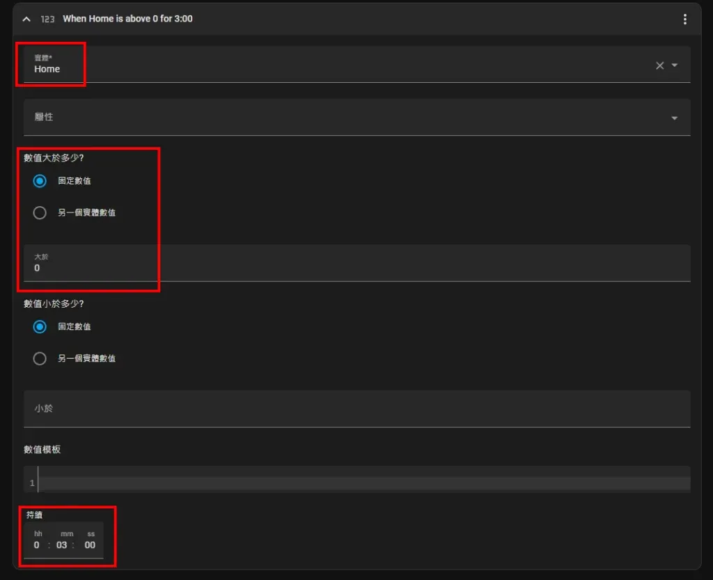 這樣的觸發設定的效果白話來說就是:當在家人數從 "0 人" 改變為 "大於 0 人" 維持 3 分鐘時觸發這個自動化。
