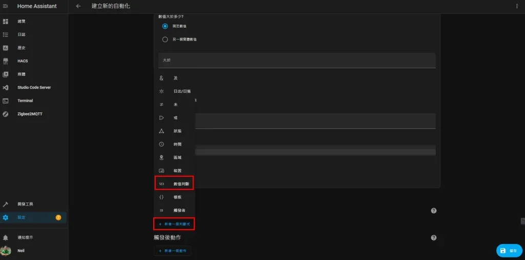 選擇「新增一個判斷式」➜「數值判斷」,在這裡我們要判斷室內溫度來決定要不要開冷氣。