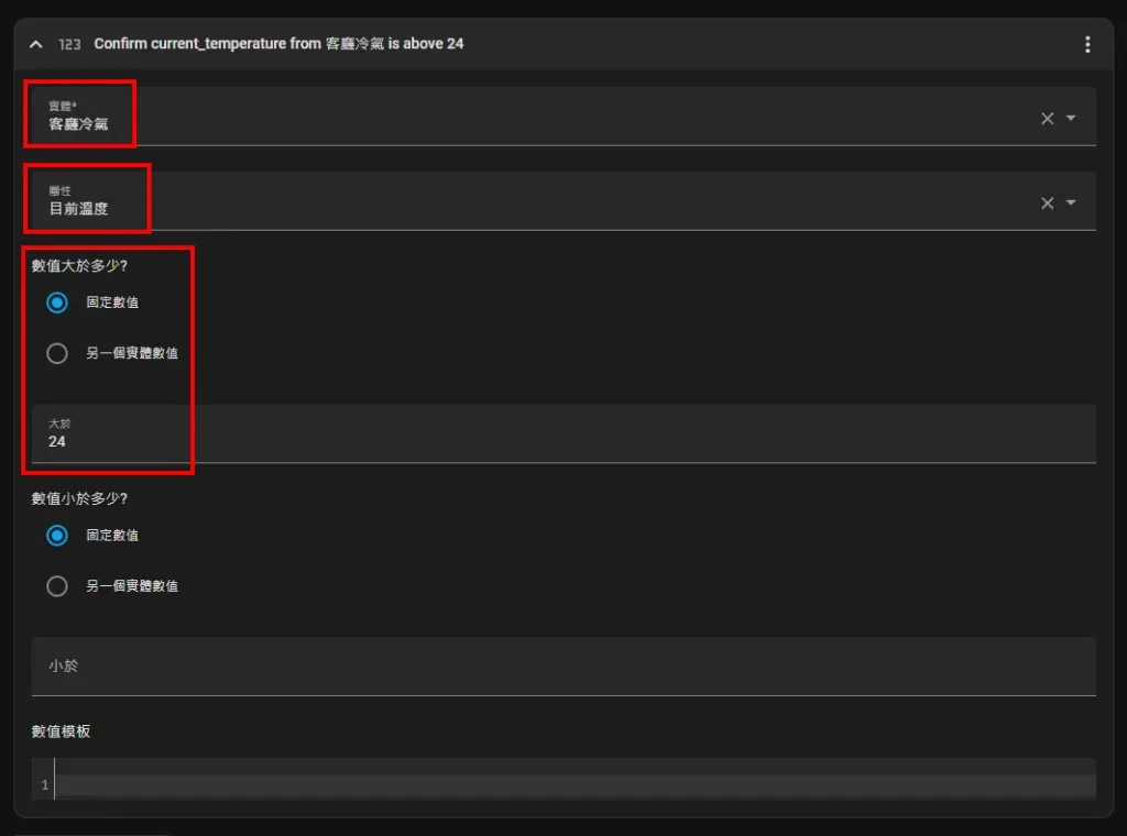 - 「屬性」選 "目前溫度":這就要看你用來判斷溫度的裝置有提供哪些屬性,這裡我選 "目前溫度"。