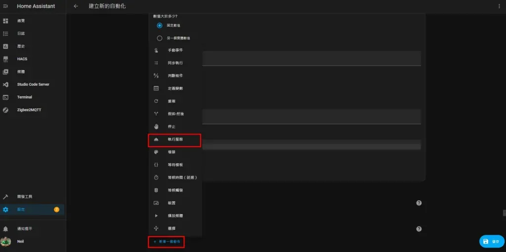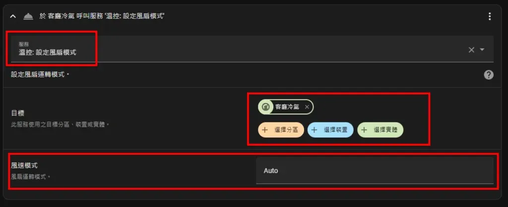 選擇「新增一個動作」➜「執行服務」,在這裡我們會用到兩個「執行服務」分別設定目標溫度和風扇模式。
