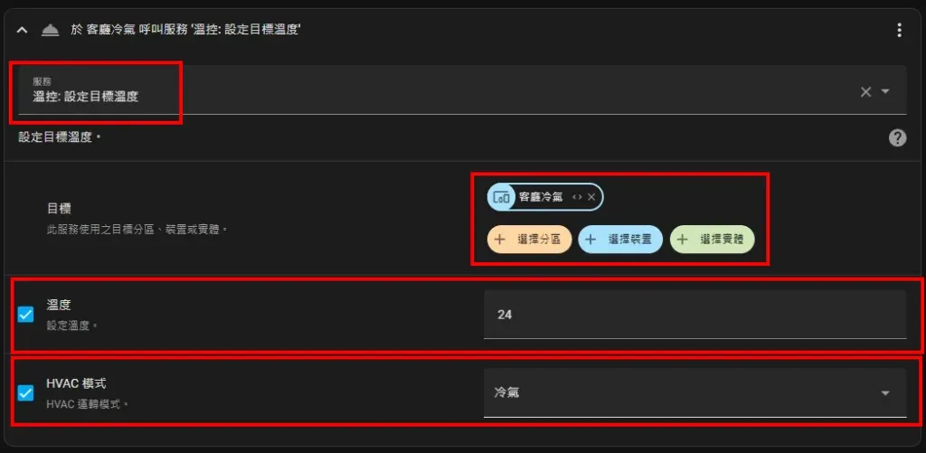 - 「實體」選擇用來判斷室內溫度的裝置:我們家是直接用冷氣來判斷室內溫度,如果你有另外裝溫度傳感器也可以在這裡選用。