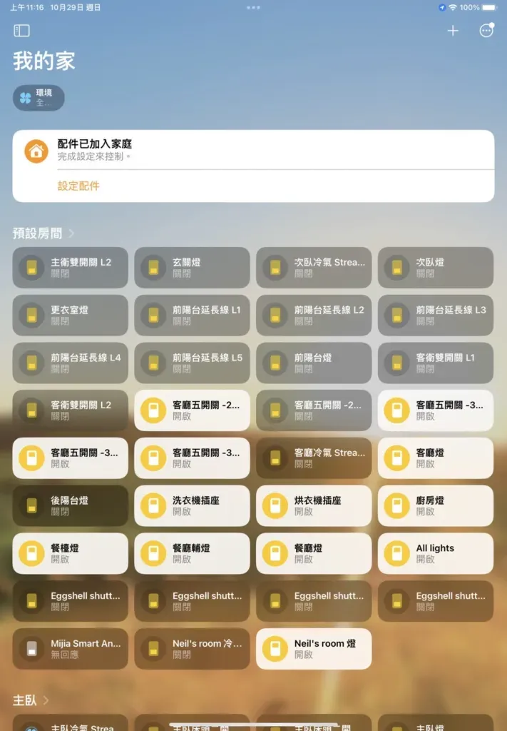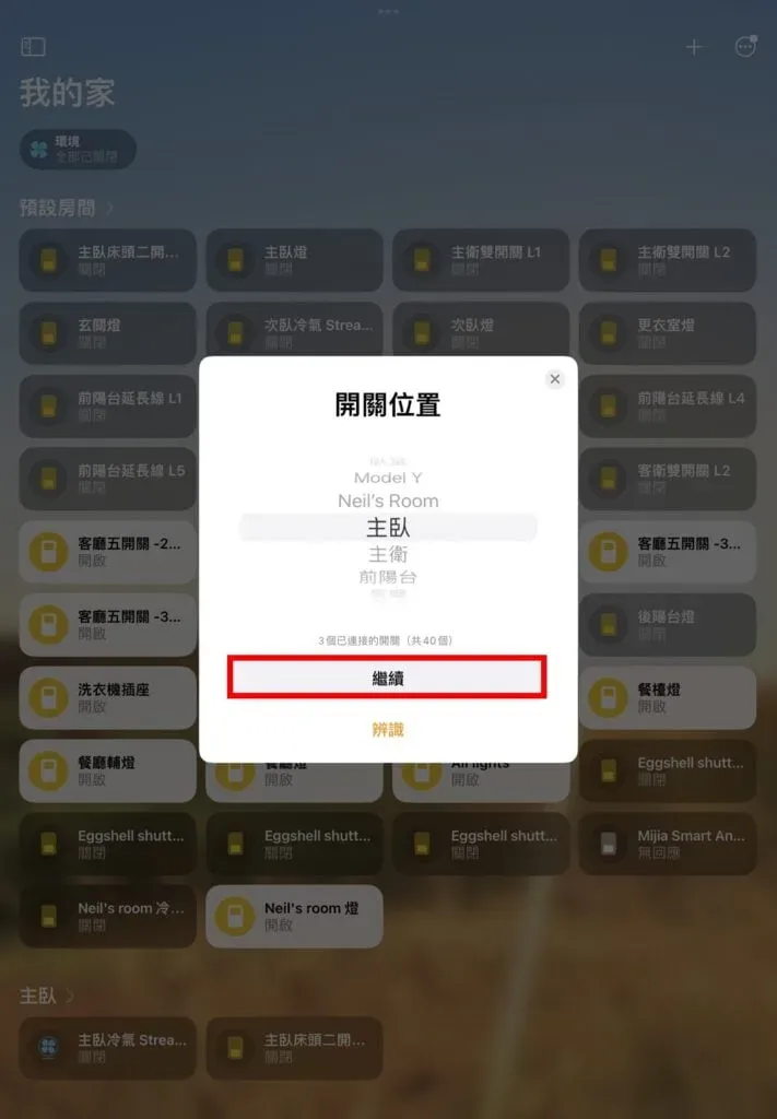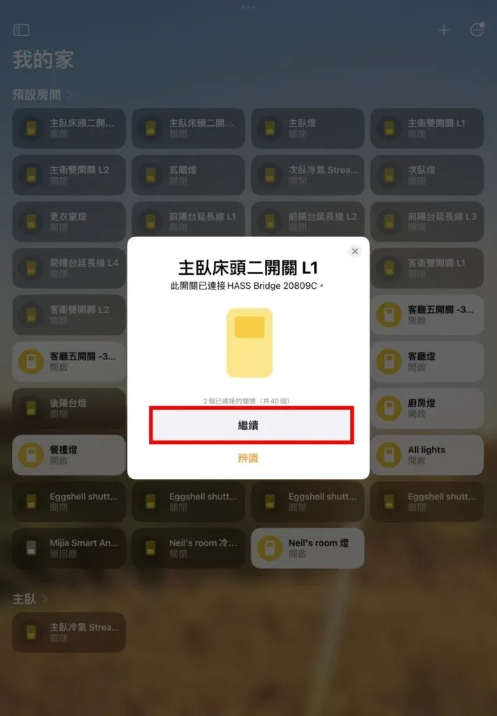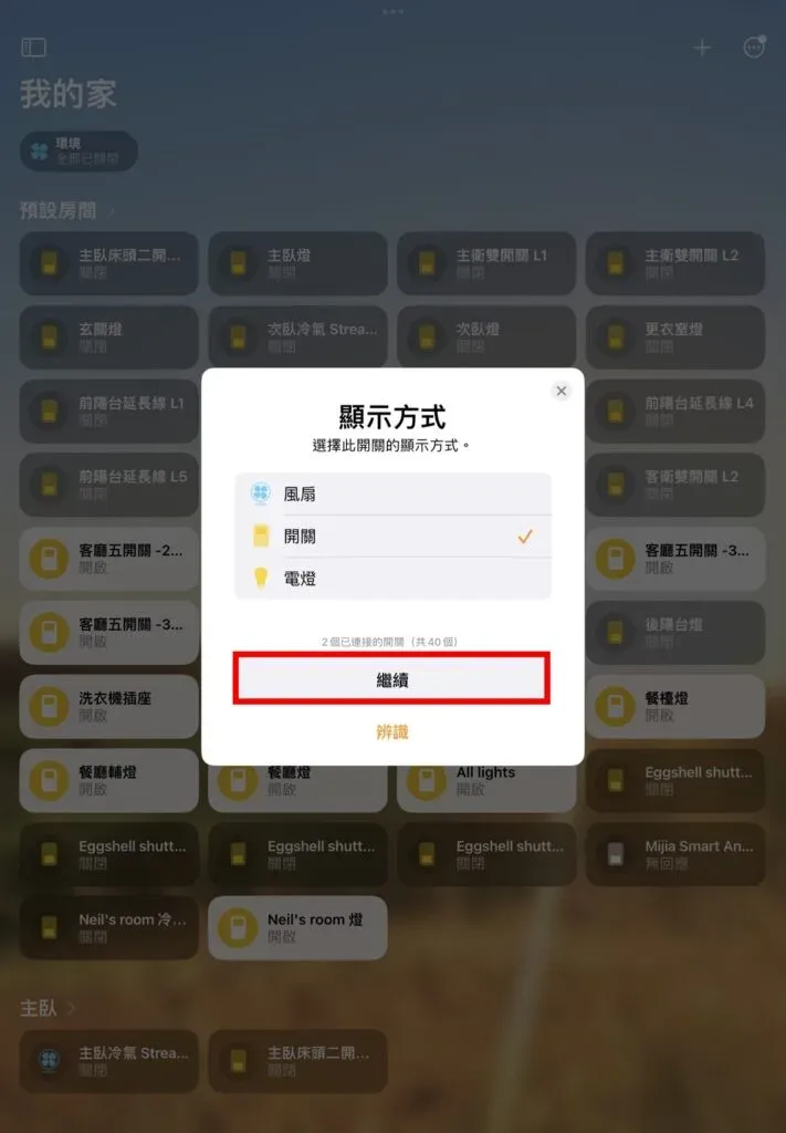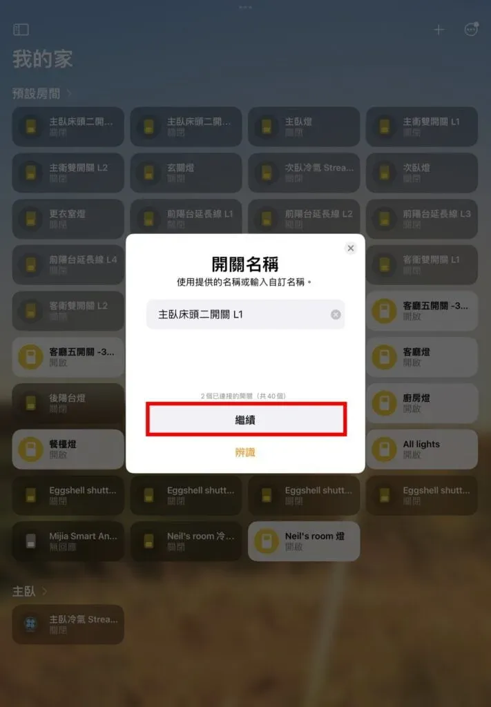 接下來就和平常加入 HomeKit 裝置一樣一步步設定全部裝置所在的房間、名稱、顯示方式。