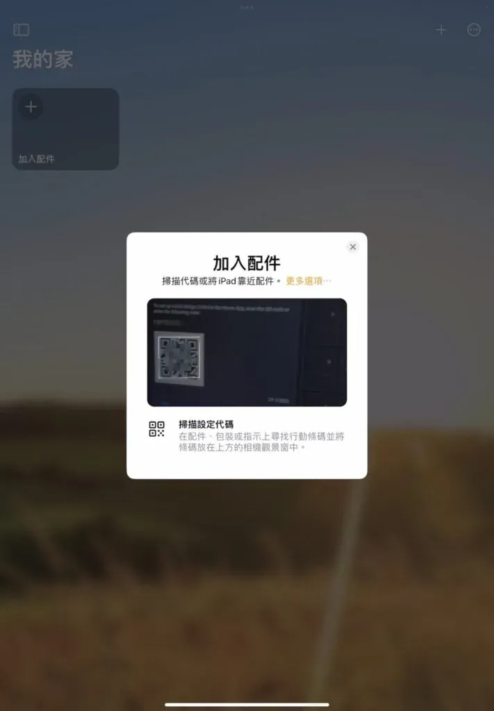 在「家庭」APP 中點擊「加入配件」後掃描 Home Assistant 提供的 QR code。