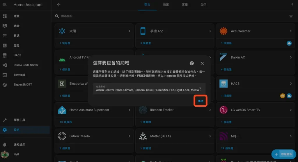 這一步是選擇哪些類型的智慧家庭裝置要從 Home Assistant 同步到 HomeKit 中,如果沒有特別考量就用預設全選直接點擊「傳送」,這個設定未來都還可以調整,別擔心!