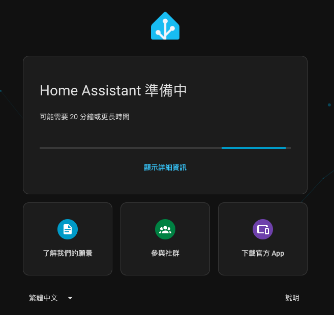 - 最後看到這個畫面就代表 Home Assistant 已經安裝完成囉!恭喜你!整個 Home Assistant 建置最麻煩的部分都完成了!